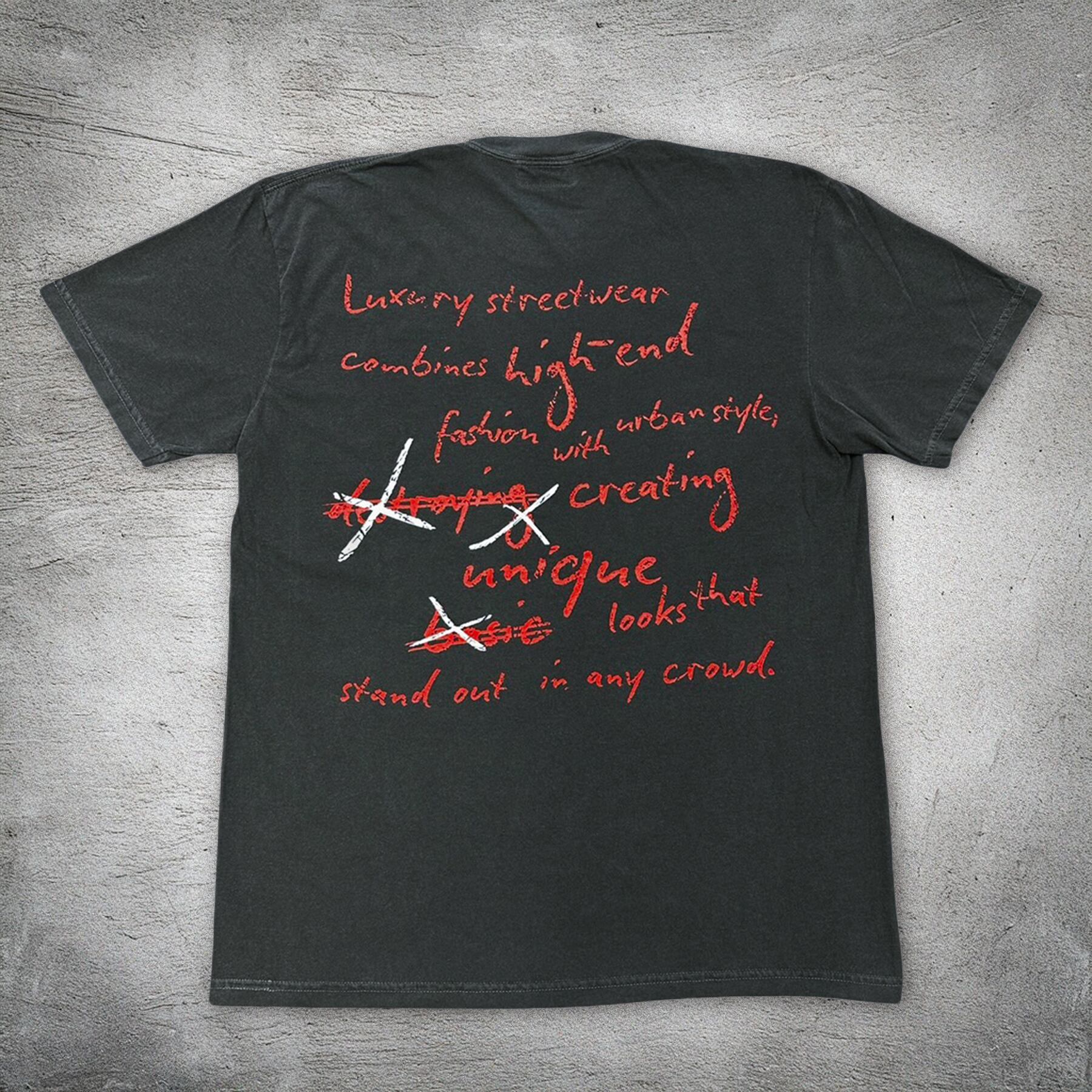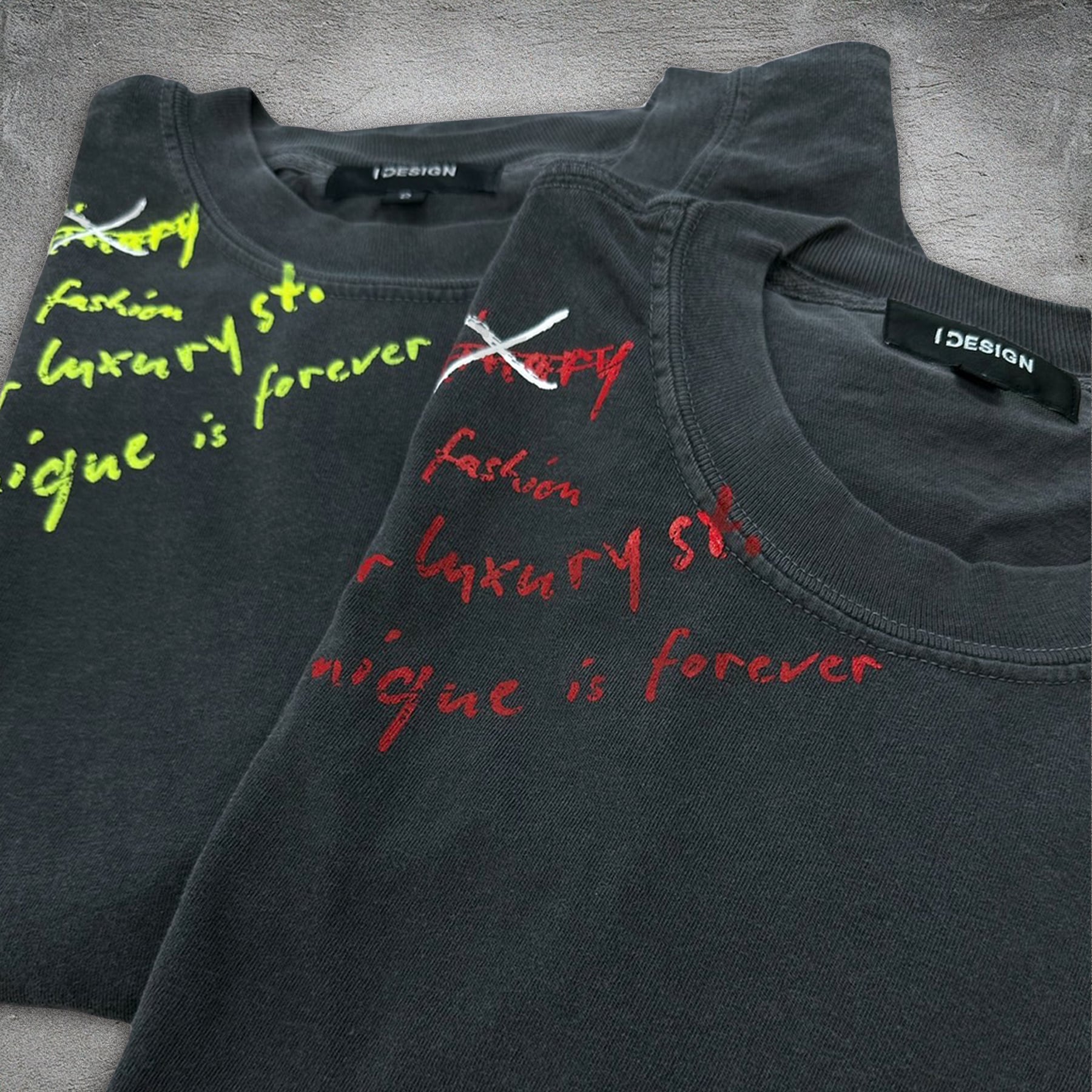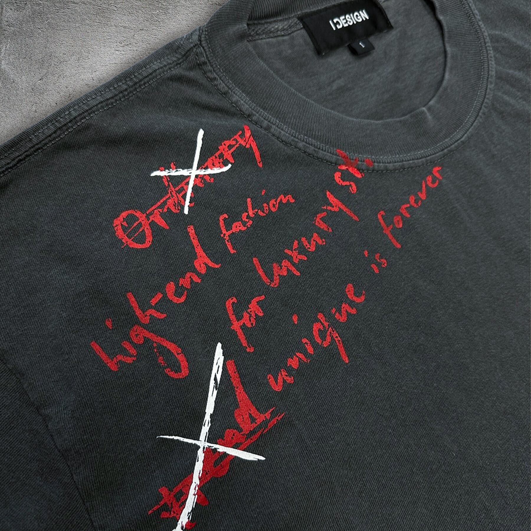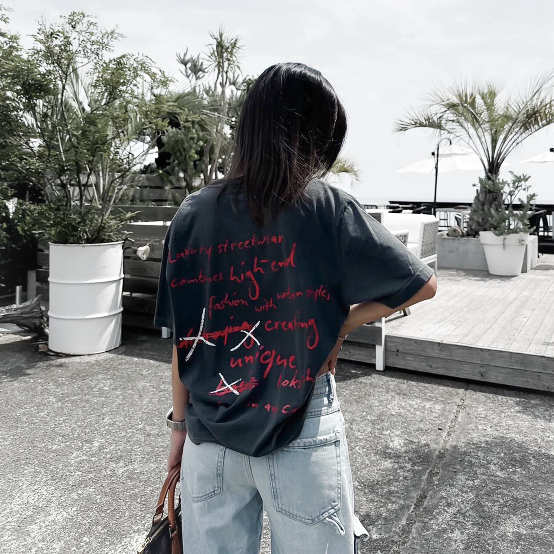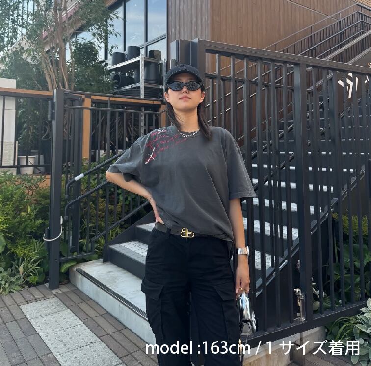 後染めによる独特なフェード感と、グランジなメッセージプリントがが印象的なTシャツ。