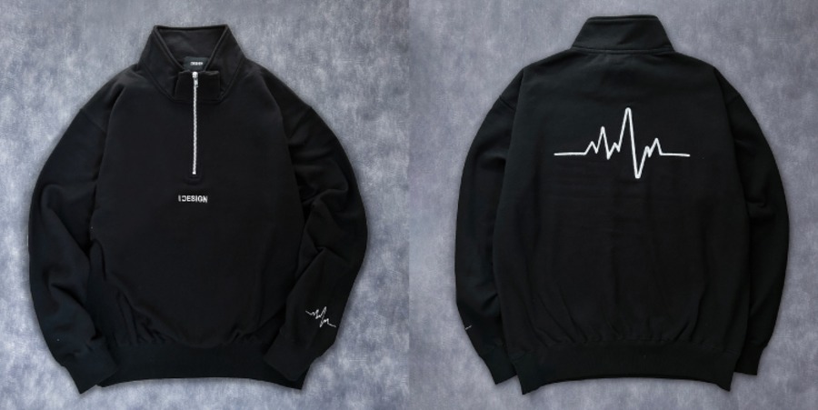 背面いっぱいに走るハートビートの3D刺繍が印象的な裏毛ハーフジップスウェット。