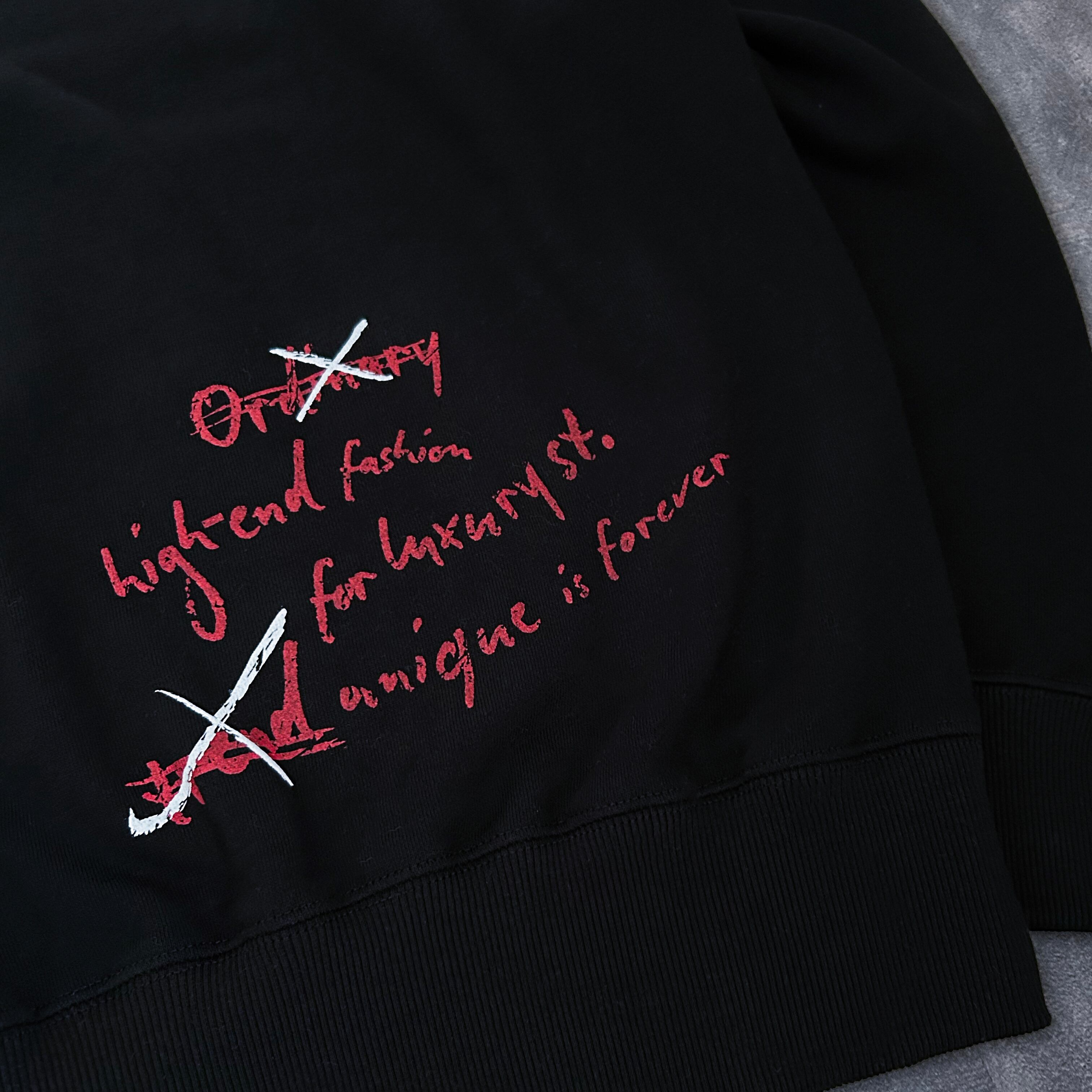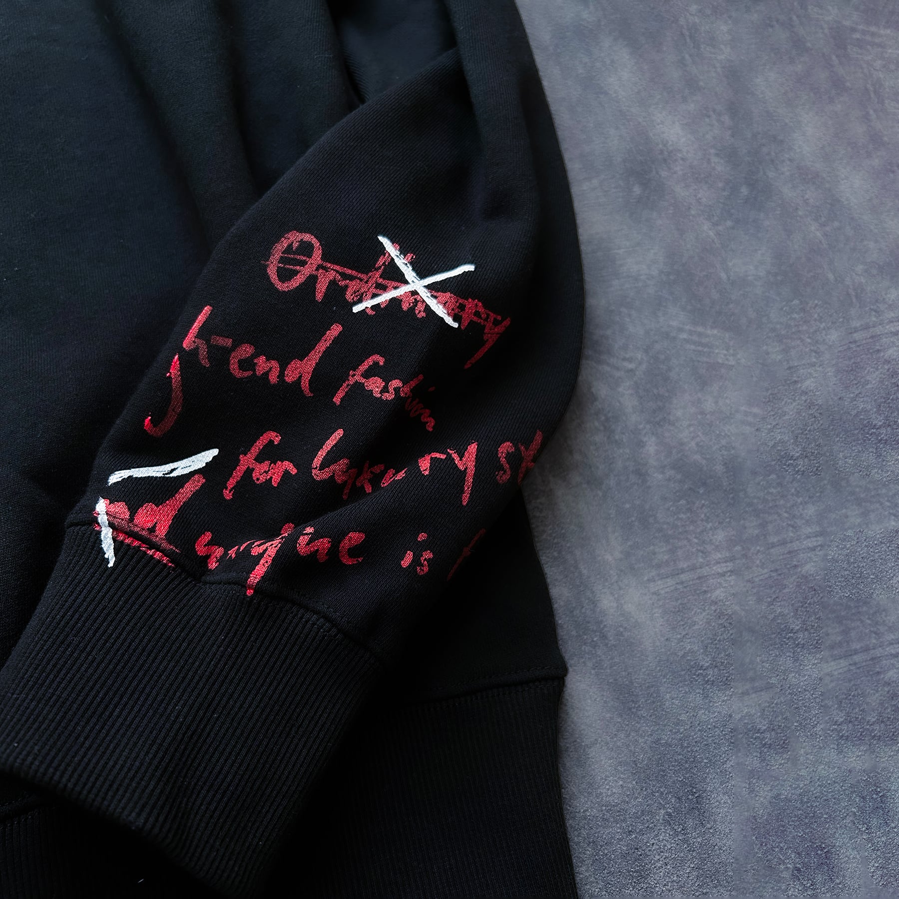 左袖とバックに配置した赤と白のメッセージプリントが、