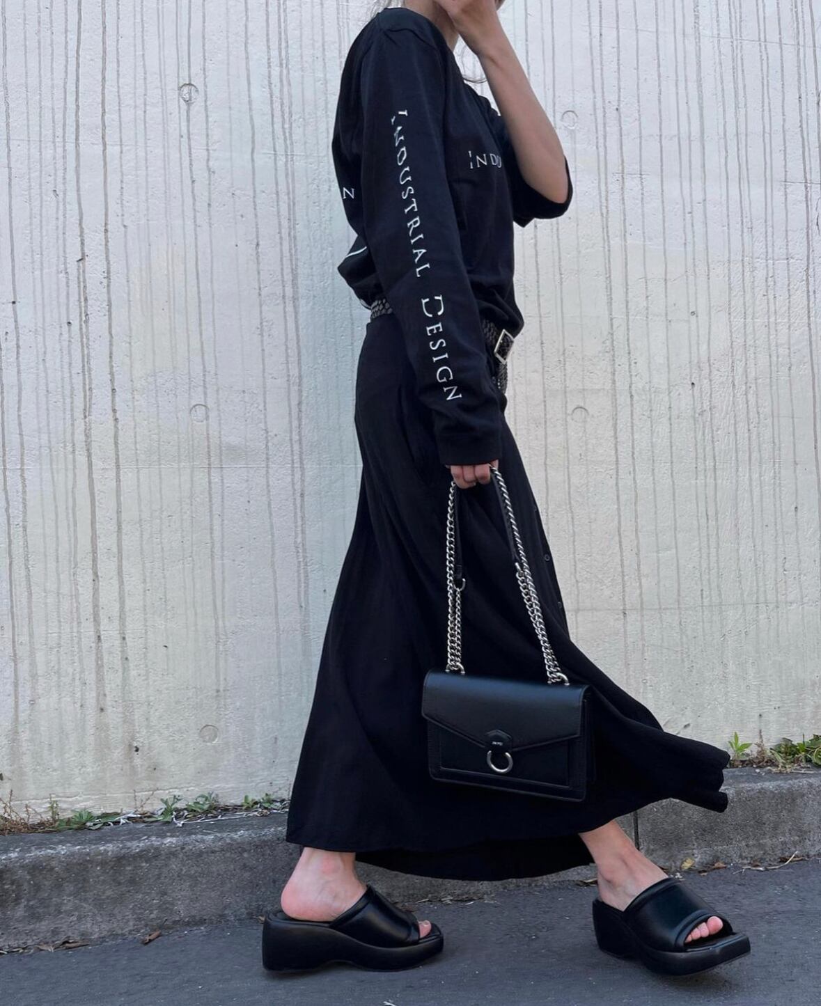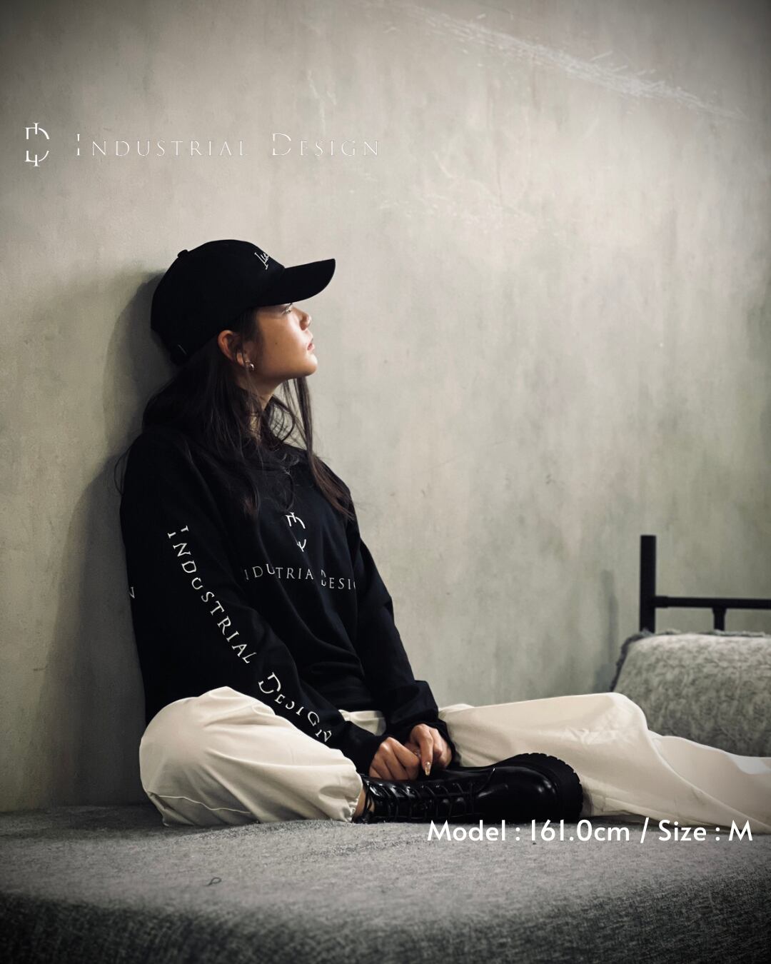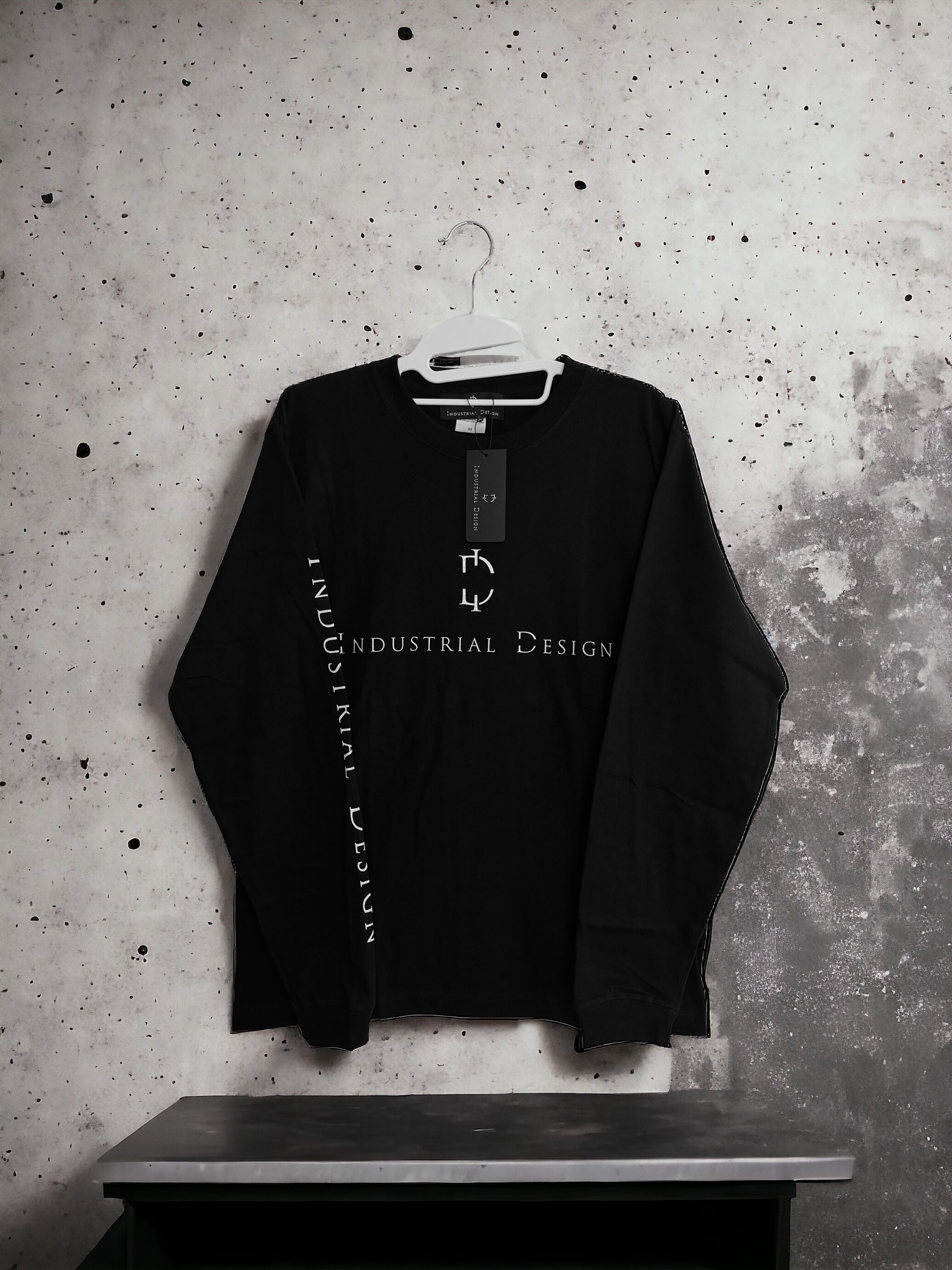 背面と右腕にIndustrial Designのロゴが入った、オーバーサイズ目のロングスリーブTシャツ。